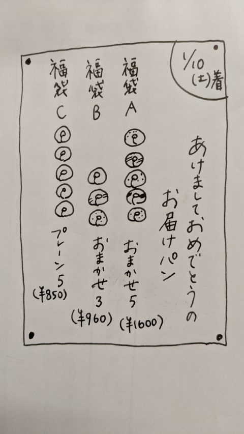 福袋のほかに、合計個数が9〜10個になるようにお選びください。福袋はおひとりさま1袋でお願いします